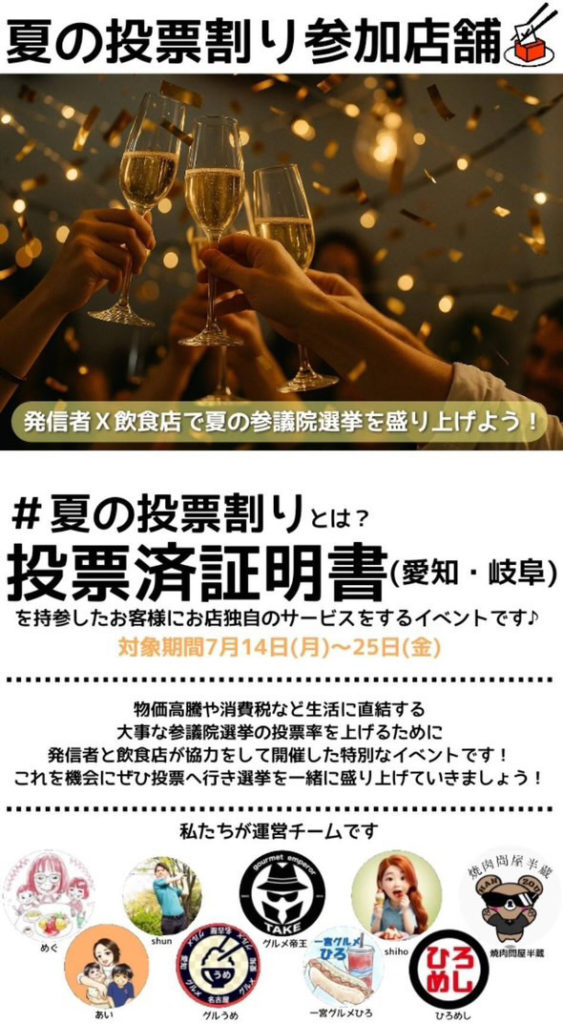 今回の取り組みは愛知県、岐阜県にお住まいの方で投票済証明書をお持ちいただきご来店いただいたお客様にサービスをさせていただくというイベントです。